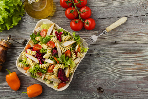 Piletinu narežite na kockice, posolite i popržite na teflonskom tiganju sa malo ulja. Testeninu skuvajte u slanoj vodi, a dok se kuva, čeri paradajz presecite na polovine, papriku na kocke. Kad se testenina skuva, isperite je hladnom vodom, ocedite, pa dodajte piletinu i povrće. U manjoj činiji pomešajte kiselu pavlaku, majonez, so, biber, bosiljak, pa prelijte sos preko paste. Pre služenja, ostavite da stoji u frižideru oko sat.
