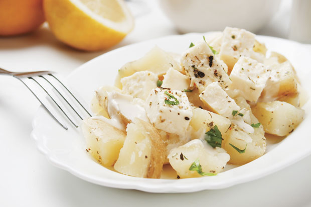 Krompir operite, pa ga skuvajte u kori. Dok se krompir kuva, propržite slaninu na malo ulja i sklonite na ubrus da se ocedi od viška masnoće. Kad se krompir skuva, ocedite ga, ogulite, narežite na komade i stavite u činiju. Dodajte naseckani mladi luk, masline, slaninu i feta sir. U činiju stavite jogurt, maslinovo ulje, sok od limuna i peršun, posolite, pobiberite i dobro promešajte. Začinite salatu pripremljenim umakom i poslužite toplu.