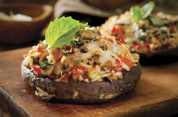 Operite pečurke, izvadite drške i propržite na malo ulja i sa jedne i druge strane minut-dva. Izvadite iz tiganja na tanjir. Na istom ulju propržite sitno naseckani mladi luk, zatim dodajte naseckane tikvice i sve zajedno propržite nekoliko minuta dok tikvica ne omekša. Izručite smesu u činiju, dodajte feta sir i naseckani bosiljak, zalijte sa nekoliko kašika maslinovog ulja i pobiberite. Napunite pečurke, pospite sa narendanim parmezanom. Pecite oko 20 minuta u rerni zagrejanoj na 180 stepeni.