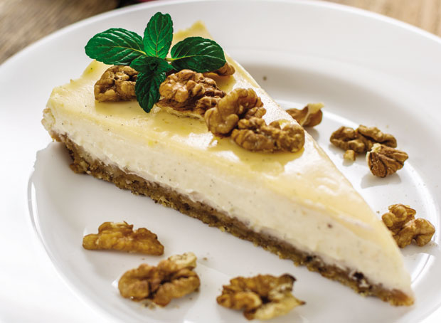 Izlupati belance, dodati šećer i, u tvrdu smesu, polako dodavati mlevene orahe pomešane sa brašnom. Dobijenu masu staviti u okrugli ili pravougaoni pleh, namašćen i posut brašnom. U rerni prethodno zagrejanoj na 180 stepeni testo peći oko 20 minuta. Za to vreme prvo dobro umutite šećer i žumanca, dodajte brašno, sok i narendanu koricu od limuna, ponovo izmiksajte. Smesu kuvajte na pari dok se skroz ne zgusne, a kad se ohladi dodajte maslac i još miksajte. Njome premažite testo i po vrhu pospite mlevene orahe. Ohladite u frižideru.