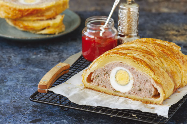 Skuvajte 2 jajeta da budu dobro tvrda. Meso sitno iseckajte i sameljite pa dodajte razmućeno jaje i mešajte dok se smesa ne ujednači. Potom dodajte sve ostale sastojke, pa sve opet dobro izmešajte. Stavite u frižider da odstoji sat vremena, da se sastojci i ukusi bolje sjedine. Potom izvadite meso i podelite na pola. Jednu razvučenu polovinu stavite na alu-foliju u tepsiji. Preko mesa poređajte očišćena kuvana jaja, pa preko njih drugu polovinu smese. Uz pomoć folije oblikujte štrudlu. Prekrijte je folijom i stavite u zagrejanu rernu na 200 stepeni da se peče oko 30 minuta. Nekoliko minuta pred kraj pečenja sklonite foliju, da bi štrudla dobila finu koricu i zlatnu boju.