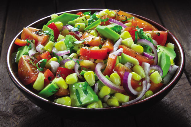 Potrebno je: 400 g čeri paradajza, 200 g kukuruza šećerca iz konzerve, 2 veća avokada, crvena paprika, pola glavice ljubičastog luka, 30 ml maslinovog ulja, 3 kašike svežeg soka limete, 2 čena pasiranog belog luka, so, biber