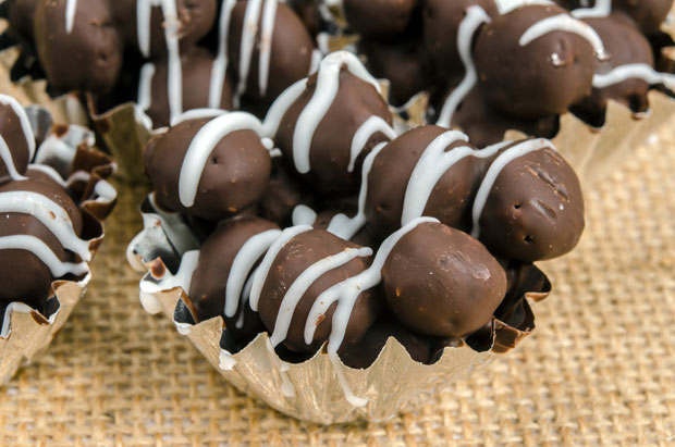 Suvo voće sameljite mašinom za mlevenje mesa, pa zamesite testo sa omekšalom čokoladom. Ostavite da se malo stegne, oblikujte kuglice i prelijte ih rastopljenom čokoladom. Kad se čokolada stegne, ukrasite je drugom čokoladom (crnu podlogu belom ili obrnuto). Možete da dekorišete i ukrasnim mrvicama.