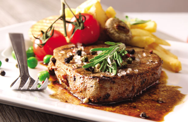 Promešajte sve sastojke za sos (maslinovo ulje, sok od limuna, biljni začin, beli luk, biber, so, peršun, tabasko sos). Šnicle premažite sa obe strane, prekrijte folijom i ostavite u frižideru najmanje sat da bi se marinada lepo upila u meso. Roštilj zagrejte i stavite marinirane šnicle. Pecite oko pet minuta sa jedne strane i pet minuta sa druge strane (ako želite bolje pečen, može i duže). Gotov biftek izvadite na tanjir i prekrijte aluminijumskom folijom i ostavite tako desetak minuta da bi meso bilo sočnije. Biftek služite uz pomfrit ili neko drugo povrće.