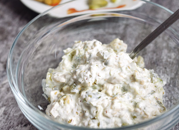 Obarite pileće grudi i ocedite, pa kad se prohlade, iseckajte u blenderu. U blenderu iseckajte i kikiriki, obični slani prženi, iz kesice. Susam propržite na suvom tiganju na srednjoj vatri mešajući dok ne dobije zlatnožutu boju. Kisele krastavce takođe iseckajte u blenderu, pa ih stavite da se malo procede. Sve sastojke promešajte, pa dodajte i kiselu pavlaku da sve poveže. Posolite, pobiberite, dodajte sok od pola limuna i dobro promešajte.