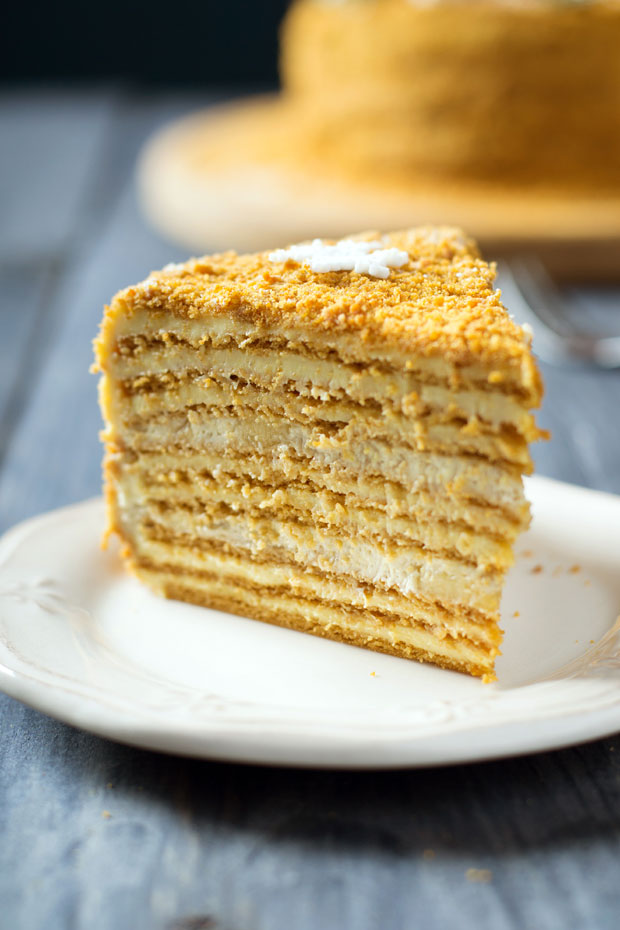 Na tihoj vatri mešajte jaja sa šećerom i medom, sve dok se šećer ne otopi, pa sklonite sa ringle. Ne treba da vri. Dodajte sodu i brašno tek toliko da biste mogli da zamesite testo pogodno za razvlačenje. Oklagijom razvucite četiri tanke kore i ispecite ih u plehu na 180 stepeni. Od ukupne količine mleka odvojite pola litre, a ostatak stavite da se kuva. U hladnom mleku razmutite brašno i šećer, tako što ćete naizmenično stavljati kašiku brašna pa kašiku šećera. Provrelo mleko sklonite sa ringle, sipajte u njega razmućeno brašno i šećer, pa vratite na vatru da se zgusne. U vruću masu dodajte margarin da se otopi i dobro izmešajte. Kore filujte vrućim nadevom, na taj način će lepo omekšati. Torta bi trebalo da odstoji nekoliko sati.