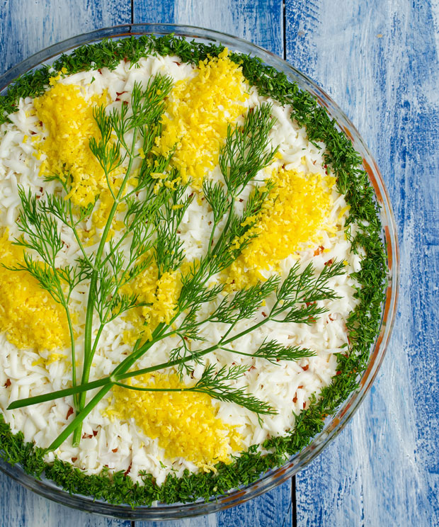 Krompir sa ljuskom i jaja obarite i ostavite da se ohlade. Napravite namaz od majoneza, pavlake i senfa. Narendajte jedno jaje, dodajte oceđenu sardinu, šunku isečenu na tanke rezance i sitno seckan luk. Lagano promešajte. U činiju krupno izrendajte oba krompira. Preko toga stavite pola mase od jaja i sardine, narendajte sloj sira. Stavite ostatak namaza, zatim narendani sir. Između pospite peršun, bosiljak, origano i biber. Poravnajte na kraju i ukrasite rendanim žumancima i svežim peršunom.