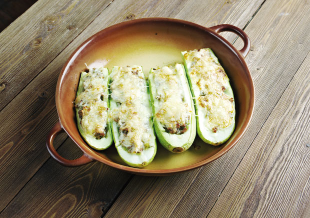 Propržite na ulju seckani crni luk i mleveno meso i začinite. Kad se prohladi, dodajte skuvani pirinač, beli luk i jaje i sve dobro sjedinite. Operite i oljušitite tikvice (ako su mlade može i sa korom) a zatim ih isecite na pola i izdubite sredinu. Blago posolite svaku tikvicu i napunite filom od mlevenog mesa. Napravite bešamel sos. Na malo ulja propržite brašno ali vodite računa da ne potamni, nalijte mleko, začinite po ukusu, kuvajte otprilike pet minuta i ostavite da se prohladi. Tikvice ređajte u vatrostalnu posudu, prelijte ih bešamel sosom a preko narendajte kačkavalj. Pecite u rerni na 180 stepeni, oko 30 minuta. Tikvice servirajte sa kiselim mlekom ili pavlakom.