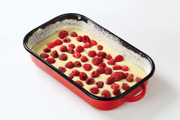 Razbijte jaja i odvojite belanca od žumanaca. Belanca mikserom umutite u čvrst sneg, uz postepeno dodavanje šećera. Potom polako dodajte žumanca, mešajući lagano špatulom. Postepeno stavljajte i ostale sastojke, jogurt, ulje, brašno i prašak za pecivo i polako sve sjedinite. Testo sipajte u podmazan i brašnom posut pleh, rasporedite maline tako da delimično potonu, pa stavite u rernu na 200 stepeni da se peče 20 minuta. Potom temperaturu smanjite na 180 stepeni i pecite još 20 minuta. Kolač je gotov kada ivice počnu da se odvajaju od zidova pleha. Kada se potpuno ohladi pospite preko dosta prah šećera sa vanilin šećerom i secite kocke.