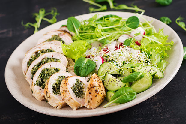Piletinu operite i nožem napravite džepove za punjenje. Zatim pomešajte so, biljni začin i biber, premažite meso i ostavite nekoliko sati u frižideru da upije začine. Spanać obarite i iseckajte, sir izmrvite i pomešajte sa spanaćem. Džepove napunite pripremljenom smesom i urolajte. Meso stavite u podmazanu vatrostalnu činiju, poklopite i pecite oko 30 minuta na 180 stepeni. Jelo služite sa svežom salatom, a kao prilog možete dodati krompir..