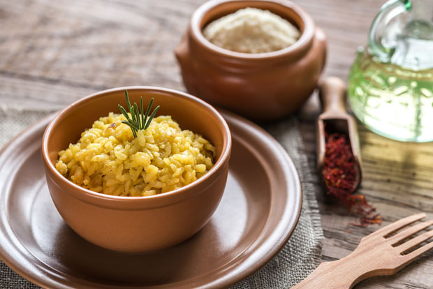 U 1,5 l ključale vode stavite kocke za supu. Kuvajte pet minuta. Na ugrejanom maslacu kratko propržite iseckani luk i lagano ga dinstajte, dolivajući supu. Stavite i opran pirinač, kratko ga propržite i dinstajte, neprekidno mešajući, postepeno dodajući vruću supu. Pred kraj dinstanja ulijte vino, ubacite suvi začin, šafran, a na kraju parmezan.