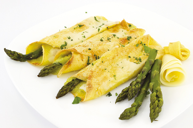 Odsecite šparglama vrhove, pa ih kuvajte 15 minuta (ako su deblje) ili ili sedam (ukoliko su mlade), na umerenoj temperaturi, u posoljenoj vodi u koju ste dodali prstohvat šećera, puter i malo limunovog soka. Obarene špargle ocedite, pa ih kratko propržite na puteru, na umerenoj temperaturi. Napravite testo za palačinke i pecite ih na puteru, tako da dobijete 10-15 komada. Svaku od njih pospite rendanim parmezanom, na sredinu stavite 2-3 špargle i urolajte ih.