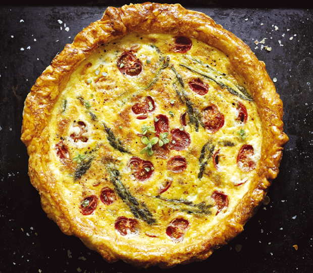 U brašno sipajte so, jaje i polako ubacujte puter isečen na listiće. Rukama utrljavajte puter i umesite glatko testo, pa ga ostavite da jedan sat odstoji u frižideru. Iseckajte šparglu na 2-3 dela, čeri na pola, a sir narendajte. Izvadite testo iz frižidera, rastanjite ga i njime obložite pleh za kiš, tako da ivice malo izviruju. Na testo stavite povrće i prelijte jajima umućenim sa kiselom pavlakom. Pecite 30 minuta u rerni zagrejanoj na 200 stepeni i služiti toplo, isečeno na trouglove.