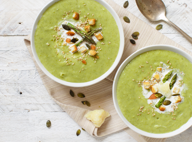 U činiji dobro zamešajte bosiljak sa sirom, pa dodajte so i biber po ukusu. Manjom kašikom za sladoled, prethodno naprskanom uljem, vadite kugle sira i ređajte ih na papir za pečenje i tako prebacite u frižider da se hlade 30 minuta. U dubljoj šerpi zagrejte puter, pa na njemu 3-4 minuta pržite praziluk. Dodajte pileću supu, špargle i bosiljak, so i biber po ukusu, i kuvajte 20 minuta na umerenoj temperaturi, dok špargla ne omekša. Izmešajte štapnim mikserom, pa poslužite toplo, sa kuglom sira.