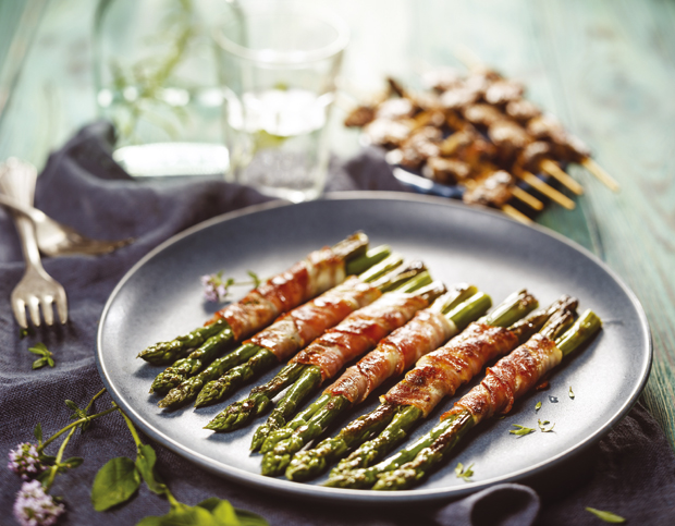 Očistite šparglu tako što ćete odstraniti tvrde delove, pa svaki štapić umotajte u list pršute. Zagrejte malo maslinovog ulja u tiganju, stavite umotanu šparglu i pecite. Jelo je gotovo kad pršuta postane hrskava, a špargla i dalje zelena, ali blago hrskava.