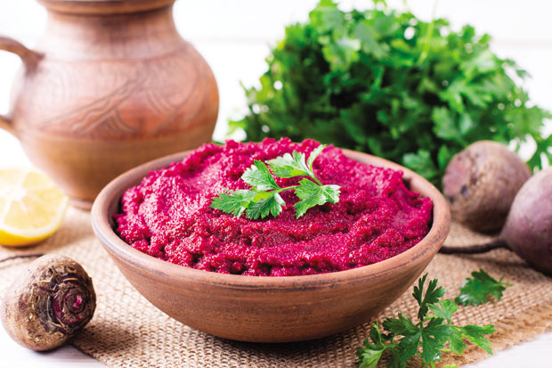Cveklu možete da skuvate, ali je ukusnija ako je ispečete u rerni. Skuvane leblebije ili iz konzerve sitno sameljite dok ne dobijete pire, dodajte cveklu i dobro umutite. Na kraju dodajte nekoliko kašika maslinovog ulja, malo soka od limuna, so, biljni začin, biber po ukusu i dobro promešajte.