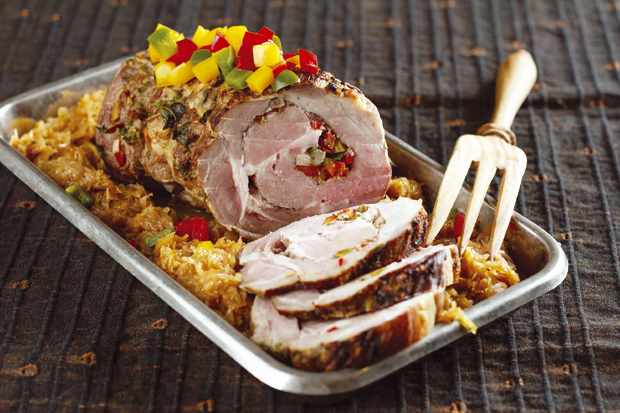 Crni luk, šargarepu i koren peršuna isecite na sitne kocke, pa ih prodinstajte na maslinovom ulju, uz povremeno dolivanje vode, sve dok povrće ne omekša (pazite da se ne raspadne). Posolite i pobiberite, pa ostavite sa strane da se prohladi. Dobro utrljajte so i biber u svinjetinu, unutrašnju stranu mesa premažite senfom, pa pospite mešavinom prethodno spremljenog povrća, ravnomerno ga raspoređujući po čitavoj površini. Meso pažljivo urolajte i uvežite kanapom, ili ubacite u mrežicu. Pecite sat i po u rerni zagrejanoj na 200 stepeni, u posudi u koju ste prethodno sipali malo ulja i vode, da prekriju dno. Na vrh stavite poklopac ili foliju, a tokom pečenja povremeno okrećite meso i polivajte ga sokom koji pusti. Nakon sat i po skinite poklopac i pecite još 30-45 minuta. Prohlađeno meso isecite na šnite i služite uz prilog po želji.