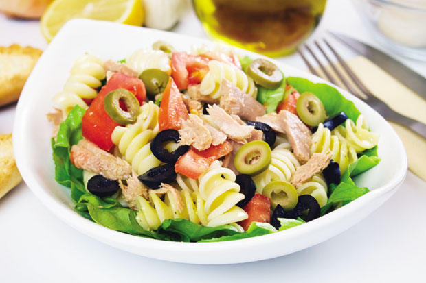 Makarone skuvajte u slanoj vodi, zatim ih dobro procedite i ostavite da se ohlade. Ocedite tunjevinu od ulja, malo je usitnite, iseckajte masline i crvenu papriku. Sve sjedinite, dodajte još malo maslinovog ulja i dobro promešajte. Umesto tunjevine, u salatu možete da stavite prženu slaninu.