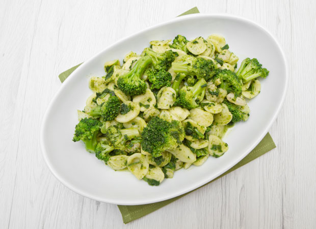 Oprane cvetove brokolija i grašak obarite u slanoj vodi, pa ocedite. Na maslinovom ulju u većem tiganju propržite sitno iseckan beli luk i ljutu papričicu. Ubacite obareno povrće i pobiberite. Sklonite sa vatre. Dodajte u tiganj testeninu skuvanu u slanoj vodi, a potom oceđenu i propranu u hladnoj. Vratite na ringlu i mešajte da se sve lepo zagreje. Gotovu pastu ukrasite iseckanim maslinama ili narendajte biljni sir.