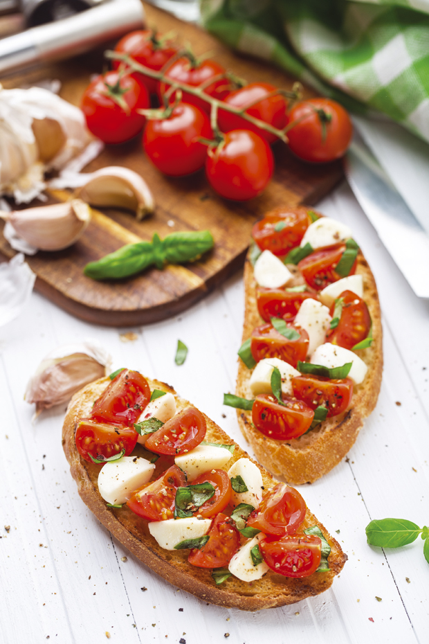 Kriške hleba premažite uljem i zapecite u rerni. Treba da porumene sa obe strane. U činiji pomešajte paradajz i mocarelu isečene na kockice, kao i usitnjen bosiljak i beli luk. Začinite, pouljite, dodajte sirće, pa sve izmešajte. Sos stavite na svaku krišku, preko pospite parmezan i vratite u rernu. Kada sir počne da se topi, otprilike posle dva minuta, bruskete su gotove.