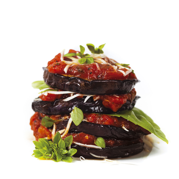 U nauljenu i pek-papirom obloženu varostalnu činiju ređajte kolutove patlidžana, premažite ih belim lukom, zatim na svaki kolut stavite paradajz, na njega opran list bosiljka, ponovo poređajte mocarelu i, za kraj, patlidžan. Stavite u zagrejanu rernu i pecite otprilike šest-sedam minuta, na 220 stepeni. Izvadite i pospite krupno rendanim parmezanom i listovima bosiljka.
