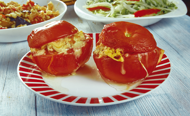 U tiganju, na dve-tri kašike maslinovog ulja, pržite iseckani luk. U činiji malo izgnječite fetu i krupno narendani ementaler, dodajte prezle i dobro promešajte. Na prženi luk dodajte pirinač i pržite ga na laganoj vatri dva minuta, pa ga stavite na dno puterom podmazane vatrostalne posude. Posolite, pobiberite, stavite paradajz koji ste oprali, odsekli mu gornji deo i malo izdubili. Sve prelijte bujonom, a paradajz napunite mešavinom sireva i prezli, poklopite ga odsečenim “kapicama”. Pecite deset minuta u rerni zagrejanoj na 200 stepeni, potom prekrijte pek-papirom i pecite još pola sata. Kada je jelo gotovo, izvadite ga iz rerne i još toplo prelijte maslinovim uljem i dekorišite iseckanim vlašcem.