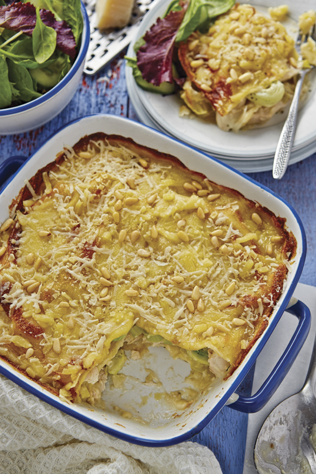 Potrebno je: 200 g kora za lazanje, 200 g pilećih grudi, 100 g praziluka, 100 g karfiola, 50 g putera, 2 kašike maslinovog ulja, seckani peršun, so, biber, ruzmarin