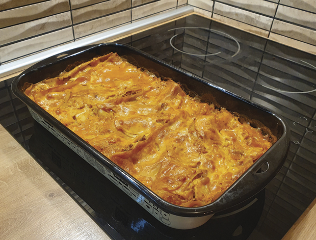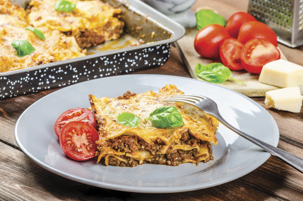 Potrebno je: 500 g kora za lazanje, 500 g mlevenog mesa (najbolje junećeg), glavica manjeg crnog luka, šargarepa, šolja paradajz sosa (po mogućstvu domaćeg), 100 g putera, 2 kašike brašna, 750 ml mleka, 300 g mocarele ili drugog sira koji se topi, kesica parmezana, maslinovo ulje, kašika suvog biljnog začina, so, biber, sveže iseckani peršun