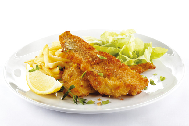 Posolite filete oslića, uvaljajte ih u kukuruzno brašno, a zatim ispržite na vrelom ulju. Prženu ribu stavite na salvetu da upije višak masnoće, a zatim je služite uz pomfrit i zelenu salatu.