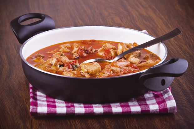 Preko očišćene i oprane ribe prelijte limunov sok, pospite biljni začin i ostavite da odstoji pola sata. U vatrostalnu posudu, na malo ulja, stavite pripremljenu ribu, krompir isečen na veće komade, seckanu papriku, crni luk i masline. Pomešajte maslinovo ulje, vino, kašiku biljnog začina i beli luk isečen na listiće. Time prelijte povrće i ribu. Pecite oko 40 minuta u rerni na 200 stepeni.
