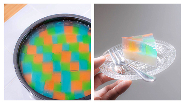 Kad su se sve smese stvrdnule, za šta je potrebno oko pola sata, izvadite ih iz frižidera. Obojeni želatin izrežite na kockice i složte na podlogu od mleka sa želeom koji je baza.
