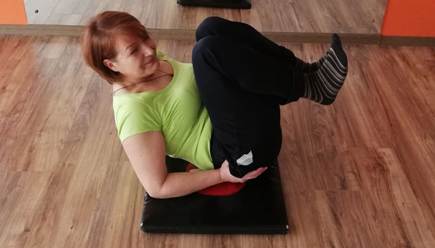 Sednite na pod sa sastavljenim i napred ispruženim nogama. Ruke su pored tela, dlanove položite na tlo ili se oslonite na podlaktice. Savijte kolena i povucite ih prema grudima. Zatim ispružite noge, tik iznad tla, kao da stopalima gurate zamišljenu loptu. Jednim pokretom podignite uvis sastavljene noge, kao da želite da zamišljenu loptu prebacite preko glave - stopala su ispružena. Ponovite četiri puta.