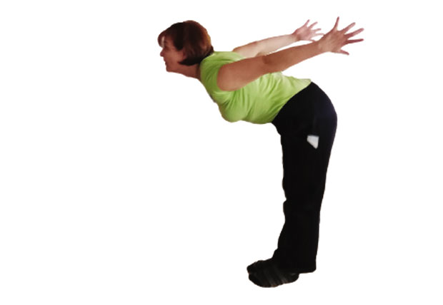 Sastavite noge i spustite se u polučučeći položaj, tako što se kolena i grudi dodiruju a ruke vise ispred kolena. Ponovite pet puta. Zatim naglim pokretom ispravite noge, podignite glavu, ispravite gornji deo tela paralelno sa tlom. Ispružite ruke, desnu napred u produžetku kičme, a levu nazad, pored tela. Ovim pokretom aktiviraćete butine.