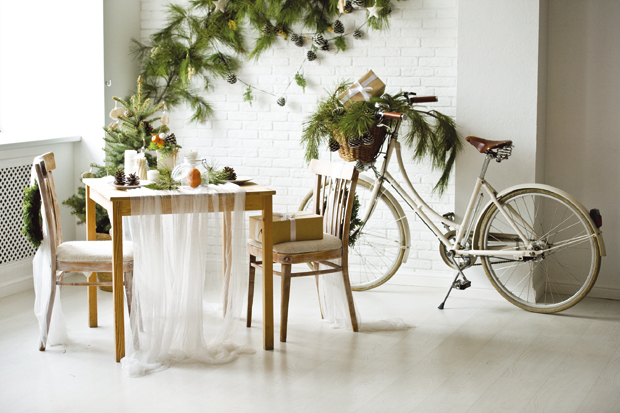 Dnevni boravak postaće bajkovit ako na zid okačite isprepletane grančice pravog drveća, ukrašene svetlećim lampicama. Na njih možete da okačite i lakše poklone i ukrase. Još jedna vrsta grančica dobrodošla je u svaki pretpraznični dom. Reč je o zimzelenim. Poigrajte se njima, formirajte različite oblike, obogatite ih svetlećim lampicama i ukrasima, zakačite ih na zid, postavite na sto, a ako vam se u sobi nalazi bicikl, eto radosti. U korpu mu ubacite grančice sa šišarkama i poklonima, pa će istog trenutka prestati da izgleda kao višak u sobi i postati moćna dekoracija.