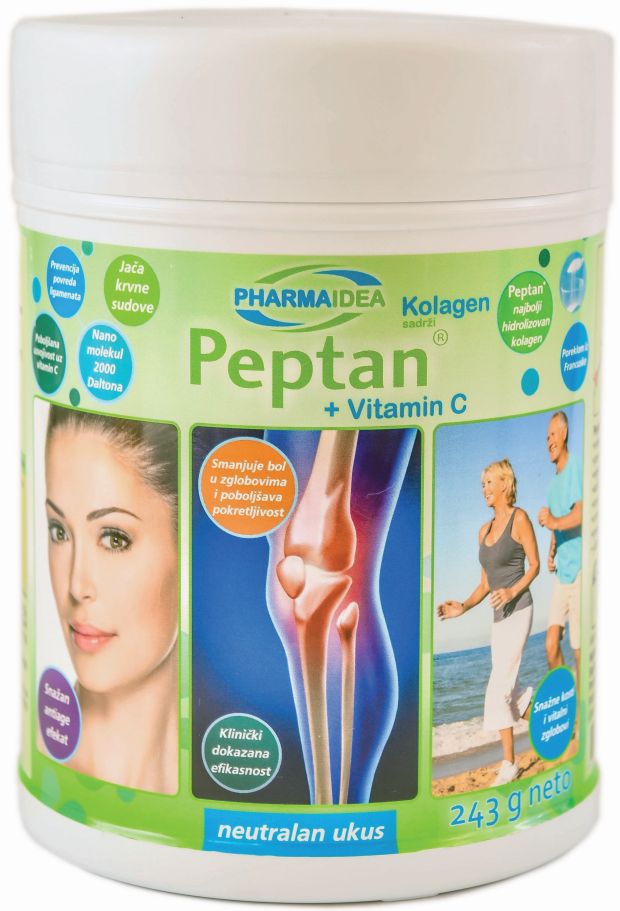 Kolagen sadrži Peptan i se dobija iz i 100 % prirodnog izvora (goveđa, svinjska ili riblja koža). Zahvaljujući maloj nano molekuli od 2000 Daltona, bioaktivni peptidi Peptana brzo stižu u delove tela gde su najpotrebniji i postižu maksimalan efekat kao gradivni materijal za lokalne ćelije kostiju , zglobova, mišića i kože. Treba obratiti pažnju na dnevnu dozu kako bismo postigli terapijski efekat , a ona iznosi 8 grama dnevno , zato su tehnolozi iz Pharmaidee ostavili da bude u obliku praška koji se razmuti u vodi i popije umesto večernjeg obroka ili nakon večere.
