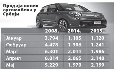 Poslednji podaci koje je objavila Srpska asocijacija uvoznika novih vozila i delova, za maj ove godine, pokazuje da je prodaja "zacementirana" na kriznom nivou. Naime, u maju je prodato 2.119 automobila, što je 149 više nego u istom mesecu prošle godine. To, međutim, ne znači da je prodaja najzad krenula u pravom smeru, jer je ta cifra manja za 129 vozila nego u aprilu ove godine.