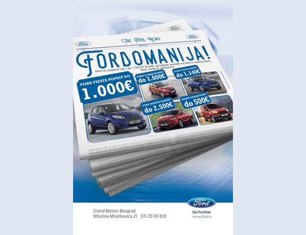 BEOGRAD – I ove godine Grand Motors, uvoznik, prodavac i serviser Fordovih automobila i lakih komercijalnih vozila, organizuje svojevrsnu prodajnu kampanju FORDOMANIJA, tokom koje se potencijalnim kupcima nudi mogućnost da novi Fordov automobil nabave po osetno nižim cenama ili da na poklon dobiju sistem za navigaciju.