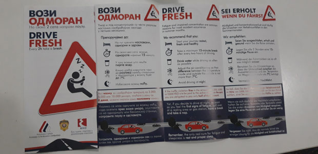 Ovo je četvrta kampanja “Vozi odmoran“ koju organizujemo. Na graničnim prelazima, na odmorištima delićemo i flajere koji su štampani na četiri jezika, srpskom, engleskom, nemačkom i turskom u kojima uz savet da se posle dva sata vožnje odmara, daju i najosnovnije informacije u saobraćaju u Srbiji, kaže Jasmina Milošević direktor Agencije za bezbednost saobraćaja Srbije.