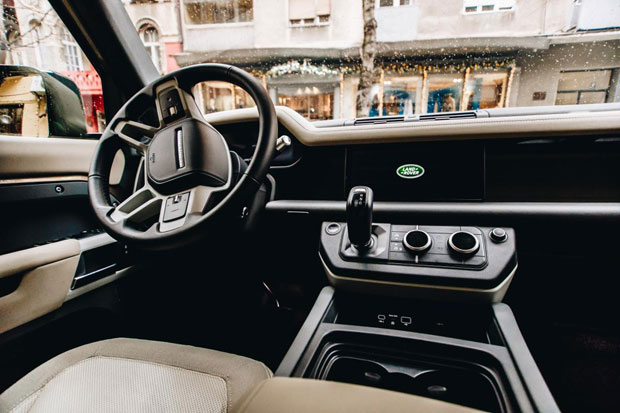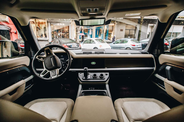 Karakterističnost originalnog modela zadržana je u unutrašnjosti gde su izloženi obično skriveni strukturni elementi i spojevi, sa naglaskom na jednostavnost i praktičnost. Značajne inovacije uključuju ručicu menjača postavljenu na armaturnoj ploči kako bi se napravilo mesta za opciono prednje sklopivo sedište u sredini, što osigurava tri prednja sedišta, kao na ranim "Lend Rover" modelima