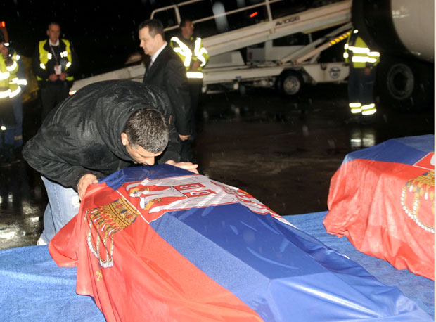 Foto N. Skenderija - Ministar Dačić pred kovčezima sa telima poginulih na beogradskom aerodromu