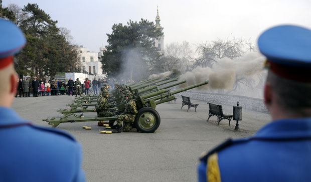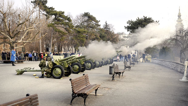 U ČAST Dana državnosti Sretenja Beogradom su se juče prolomili počasni plotuni. Gardisti Vojske Srbije sa Savskog platoa na Beogradskoj tvrđavi tačno u 16 časova ispalili su 10 plotuna iz šest artiljerijskih oruđa. Paljbi u predvečerje praznika na Kalemegdanu prethodilo je intoniranje himne "Bože pravde" i svečani raport i podizanje državne zastave.