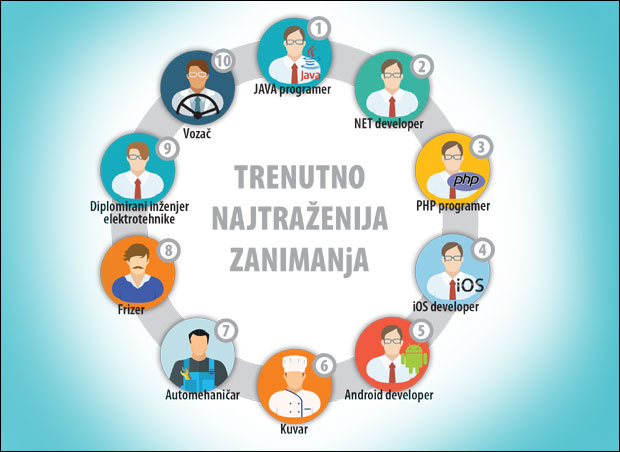 Najtraženije profesije će, prema istraživanjima “Infostuda”, biti “kompjuteraška” zanimanja, što pokazuje i trenutna potražnja za programerima JAVA, PHP, NET, IOS kao i programerima mobilnih aplikacija.