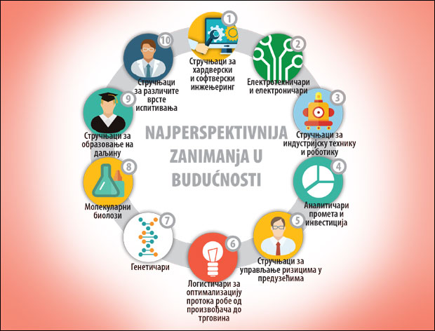 STRUČNjACI za hardverski i softverski inženjering, elektrotehniku i elektroniku, industrijsku tehniku i robotiku, oblast finansija, analitičari prometa i investicija, ali i stručnjaci za upravljanje rizicima u preduzećima, logističari za optimizaciju protoka robe od proizvođača do trgovina, samo su neke od profesija koje će narednih godina biti na listi najtraženijih i najplaćenijih u Srbiji.