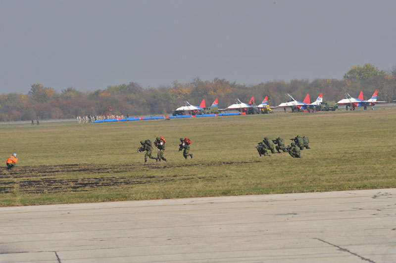 Vežba je izvedena tako što su dva aviona MIG 29 pratili avion AN-26 i prisilili ga da prinudno sleti.