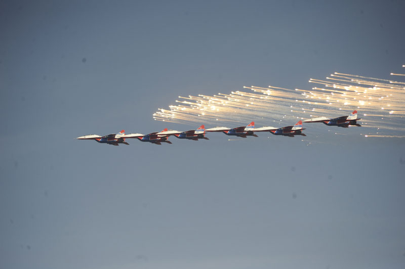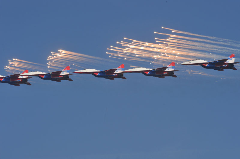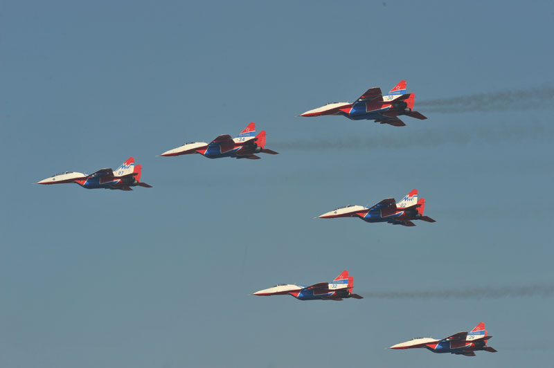 Pripadnici akro-grupe "Striži" iz Rusije sa šest aviona "mig 29" izvode dinamičan program vrhunske tehnike pilotiranja.