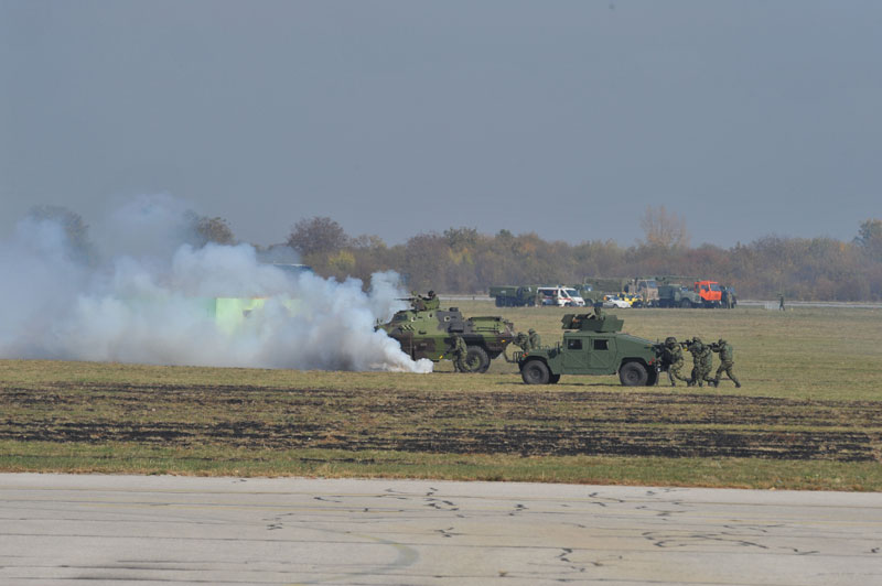 Poleteli su avioni tipa „orao“.Avion se pregleda u slučaju da se u njemu nalazi eksploziv. Pregled se obavlja uz pomoć specijalno obučenih pasa. Pronađena je eksplozivna naprava koju tehničari uklanjaju koristeći specijalnu opremu i odela. Izvršena je i kontrolisana eksplozija.
