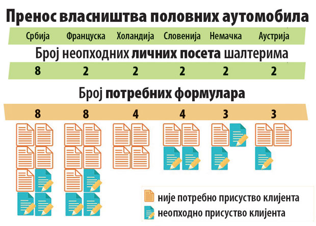 DA bi preneli vlasništvo nad polovnim automobilom naši ljudi moraju da posete četiri institucije i osam šaltera, da podnesu osam dokumenata, od kojih će četiri sami popuniti, da plate sedam pojedinačnih taksi u iznosu od 14.634 dinara, a za sve ovo potrebno im je najmanje pet dana!