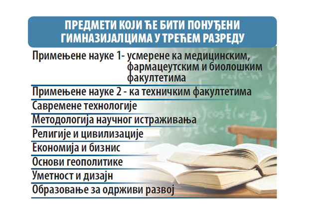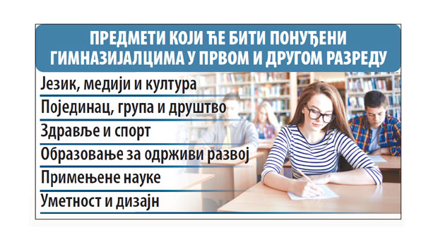 Novine se ne odnose na sadašnje gimnazijalce, već na one koji će tek da sednu u klupe. Oni će već u septembru moći da biraju između predmeta: Jezik, mediji i kultura, Pojedinac, grupa i društvo, Zdravlje i sport, Obrazovanje za održivi razvoj, Primenjene nauke, Umetnost i dizajn.
