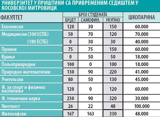 Na Univerzitetu u Novom Sadu, sudeći prema predloženim kvotama koje treba da usvoji Pokrajinska vlada, spremni su indeksi za 9.321 studenta prve godine 5.397, od kojih će 5.397 moći da studira o trošku države, a 3.924 biće samofinansirajući. Univerzitet u Nišu pripremio je 4.958 indeksa za nove studente, i to 3.233 na budžetu i 1.725 za one koji će sami finansirati svoje školovanje. U Kragujevcu mesta će biti za 3.571 brucoša, među kojima će 2.400 moći da ima besplatne studije, a ostalih 1.171 plaćaće sami. Na Univerzitetu u Prištini sa privremenim sedištem u Kosovskoj Mitrovici mesta ima za 1.768 studenata prve godine. Predviđeno je da o trošku države studira njih 1.098, a 670 će morati sami da snose troškove školarine.