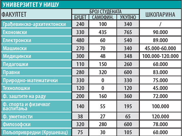 NA Univerzitetu u Beogradu samo je Matematički fakultet na pojedinim smerovima povećao školarinu od 6.000 do 12.000 dinara, dok je cena studija za nastavnike matematike ostala ista. Skuplje je i na Fakultetu za građevinarstvo u Kraljevu, ali i sa poskupljenjem njihove školarine su među najjeftinijima - 40.000 dinara. Za deset odsto skuplje je i na Tehničkom fakultetu u Čačku, dok je Filološko-umetnički fakultet u Kragujevcu odlučio da snizi cene školarine na pojedinim smerovima.